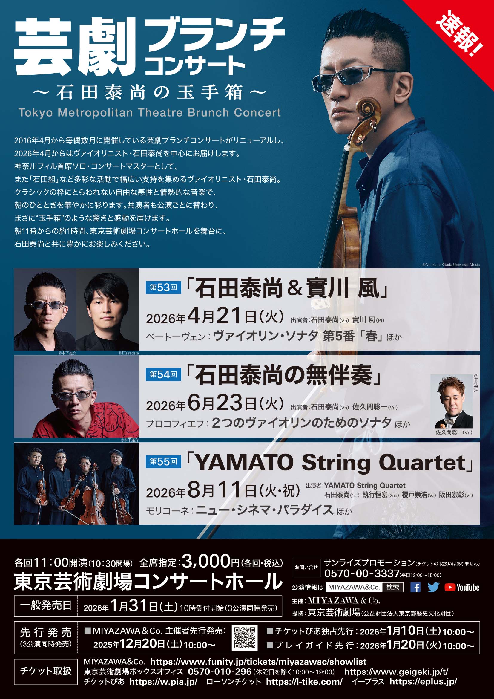 2016年4月から毎偶数月に開催している芸劇ブランチコンサートがリニューアルし、2026年4月からはヴァイオリニスト・石田泰尚を中心にお届けします。
